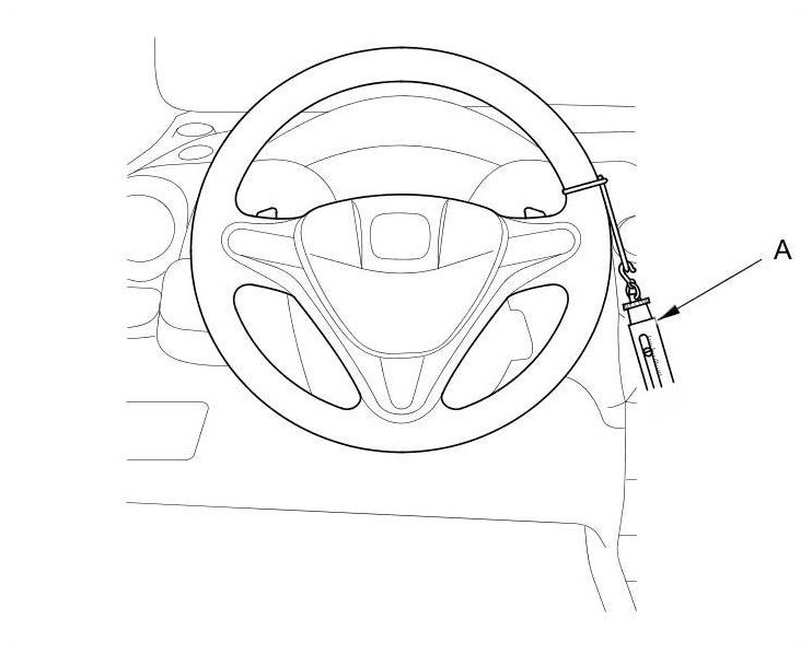 2. Attach a commercially available spring scale (A) to the steering wheel. With the engine idling and the vehicle on a clean, dry floor, pull the scale as shown, and read it as soon as the tires begin to turn.