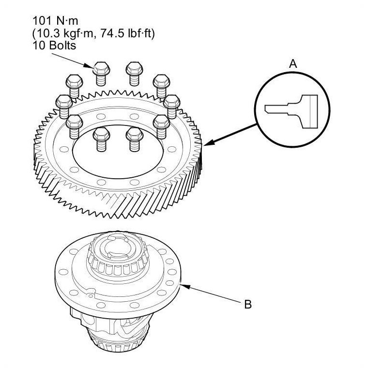 1. Remove the final driven gear (A) from the differential carrier (B). The final driven gear bolts have left-hand threads.