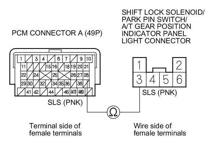 14. Check for continuity between PCM connector terminal A28 and shift lock solenoid/park pin switch/A/T gear position indicator panel light connector terminal No. 3.