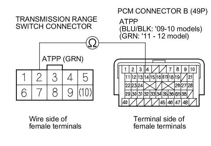 Repair open in the wire between PCM connector terminal B14 and the transmission range switch.