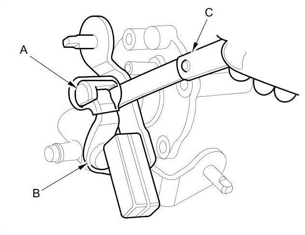 1. Measure the clearance between the change lever (A) and the select lever (B) with a feeler gauge (C). If the clearance is more than the service limit, go to step 2.