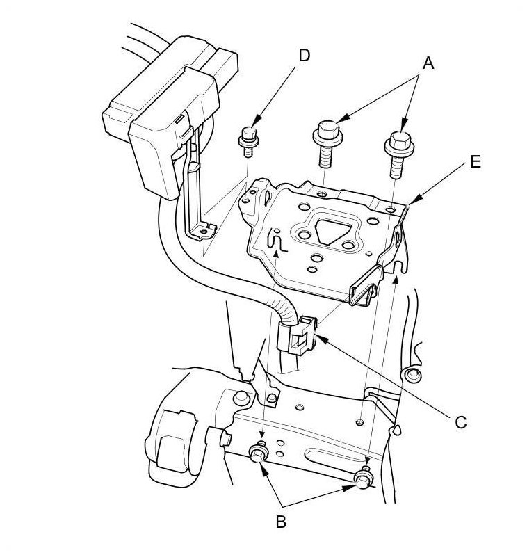 9. Remove the battery base bolts (A), loosen the two bolts (B), remove the battery harness clamp (C) and the bracket bolt (D), then remove the battery base (E).