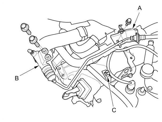 10. Remove the clutch hose bracket (A) and the slave cylinder (B). Remove the clutch line from the clip (C), then carefully move the slave cylinder out of the way to avoid bending the clutch line.