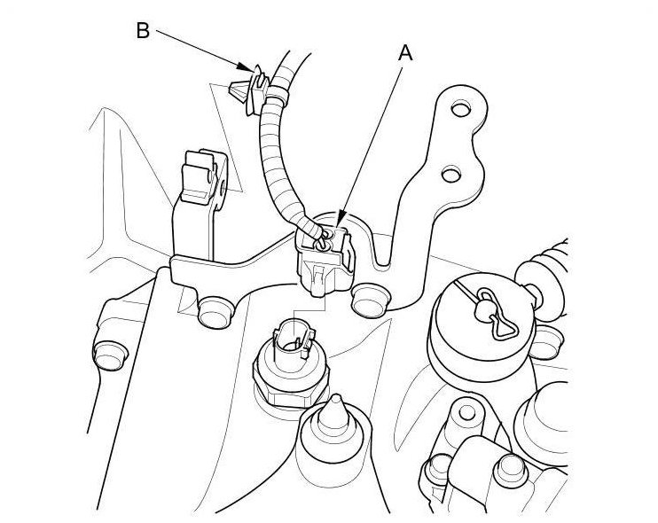 11. Disconnect the back-up light switch connector (A), then remove the harness clip (B).