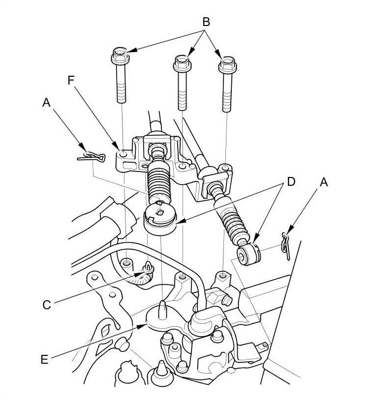 12. Remove the lock pins (A), shift cable bracket bolts (B), and harness clip (C), then disconnect the shift cables (D) from the change lever assembly (E). Carefully remove both cables and the shift cable bracket (F) together to avoid bending the cables.