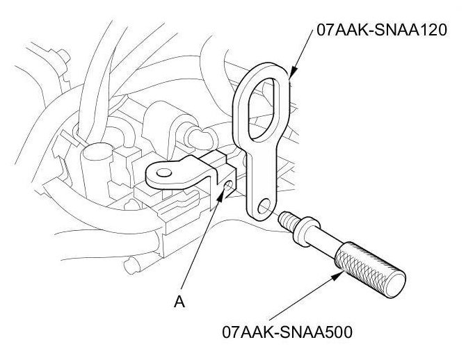 14. Install the universal lifting eyelet (07AAK-SNAA120) to the bolt hole (A) at the air cleaner housing mounting bracket with the 1.8 support bolt (07AAK-SNAA500).
