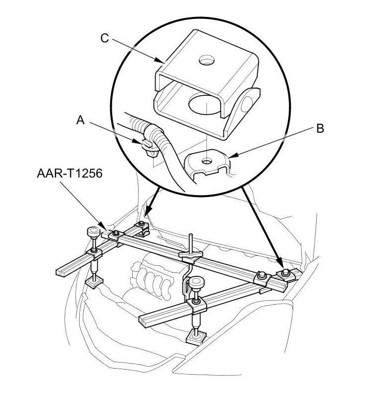 16. Set up the engine support hanger (AAR-T1256). Carefully position the engine support hanger to the vehicle; position both cross-arm foot bases (C) over the harness clamp brackets on both sides, and position both front stands on the front bulkhead. Attach the hook to the universal eyelet, tighten the wing nut by hand, and lift and support the engine.