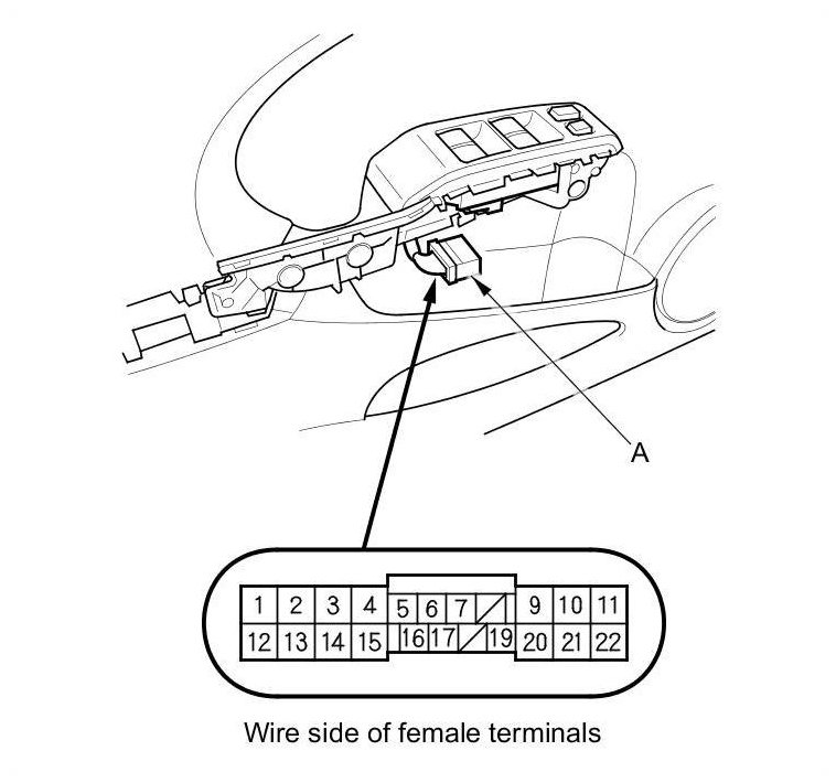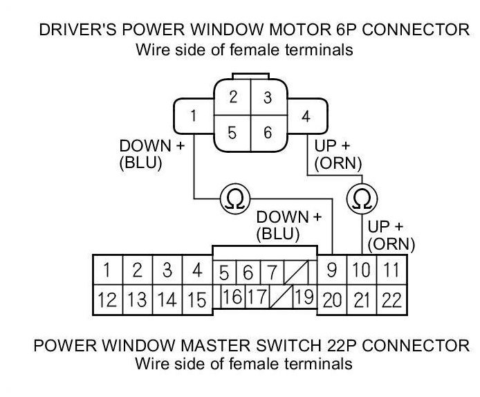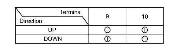 2. Test the motor in each direction by connecting battery power and ground to the power window master switch 22P connector (A) according to the table.
