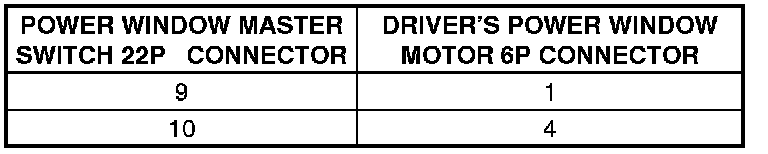 6. Check for continuity between power window master switch 22P connector terminals No. 9 and No. 10 and driver's power window motor 6P connector terminals No. 1 and No. 4 respectively. There should be continuity.