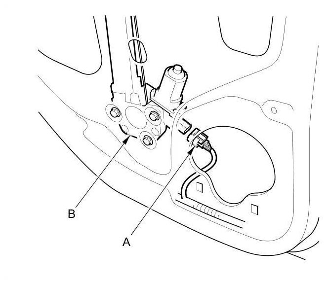 5. Disconnect the 2P connector (A) from the rear power window motor (B).