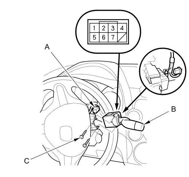 3. Turn the steering wheel to access the wiper/washer switch screws (C).