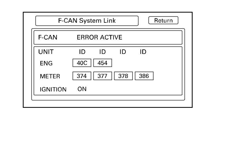- If F-CAN shows ERROR ACTIVE, an error is not detected between F-CAN bus and the audio-navigation unit. If any error is detected, check for diagnostic trouble codes (DTCs) for the F-CAN with the HDS (Honda Diagnostic System). The data displayed in the ID boxes is for factory use only.