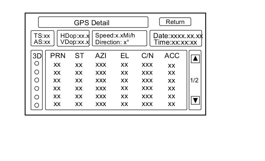By pressing and holding the MENU button for 2 seconds, a GPS Detail screen appears. This screen displays real time incoming satellite positional data when the vehicle is outside in the open. The information shown on this screen is for factory use.