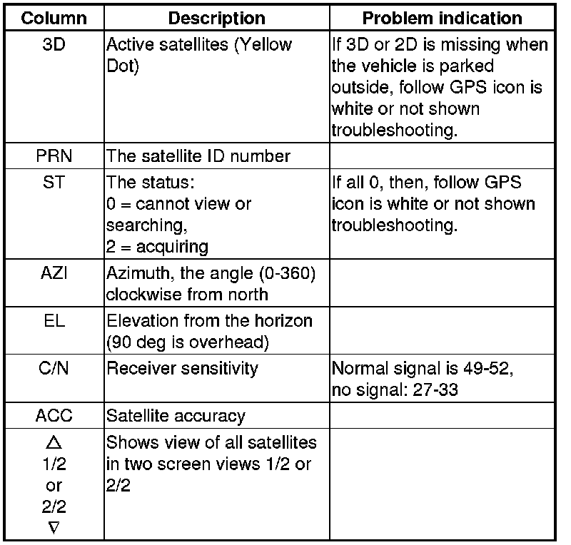 - If the row of data in the table below begins with a yellow dot, the AZI and EL fields can be used to locate each satellite on the circular GPS diagram (see prior screen).