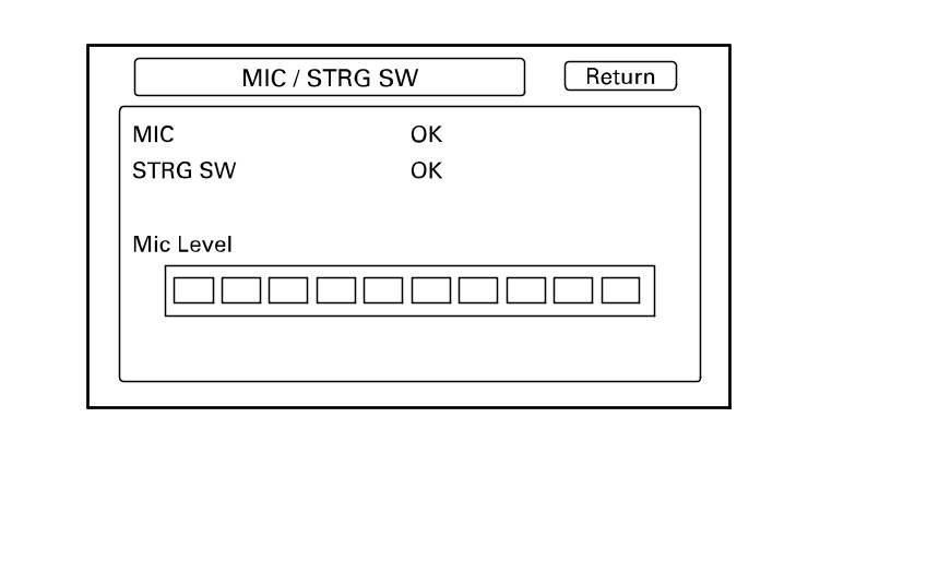 Press the navigation TALK button on the steering wheel, wait until you hear a beep, and in a normal voice say "testing". The TALK indicator on the screen should momentarily turn green, and the text "Now Recording..." should appear in yellow. If the talk indicator shown on the screen does not briefly turn green, check the wiring from the steering wheel navigation TALK button to the audio-navigation unit. If there is no Mic Level movement when you speak, then you should check the wires running from the microphone to the HandsFreeLink control unit and the audio-navigation unit. If the wires are OK, the microphone must be faulty; replace the microphone.