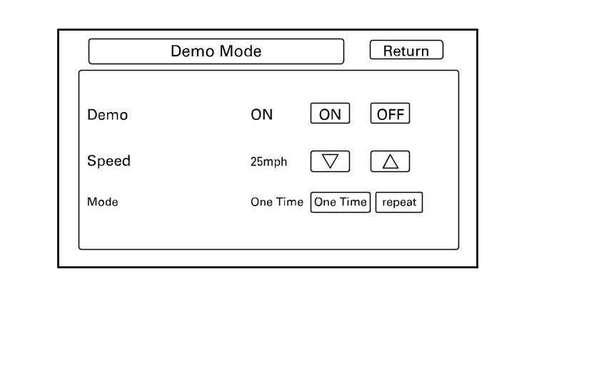 This screen is for factory use only, and should always be set to OFF. Occasionally DEMO setting is turned ON when vehicles are being used at auto shows or similar events. Turning this feature on, allows the navigation system to automatically follow a route to a destination when the vehicle is stationary. Speed changes the speed of the demo mode.