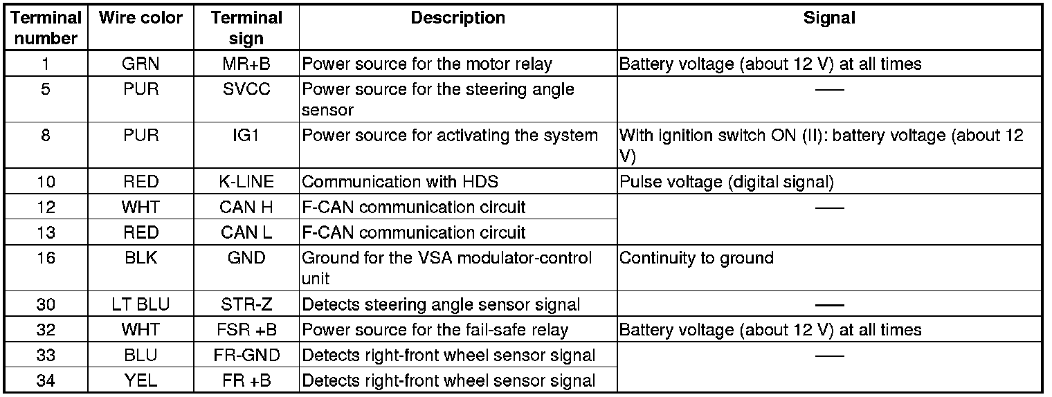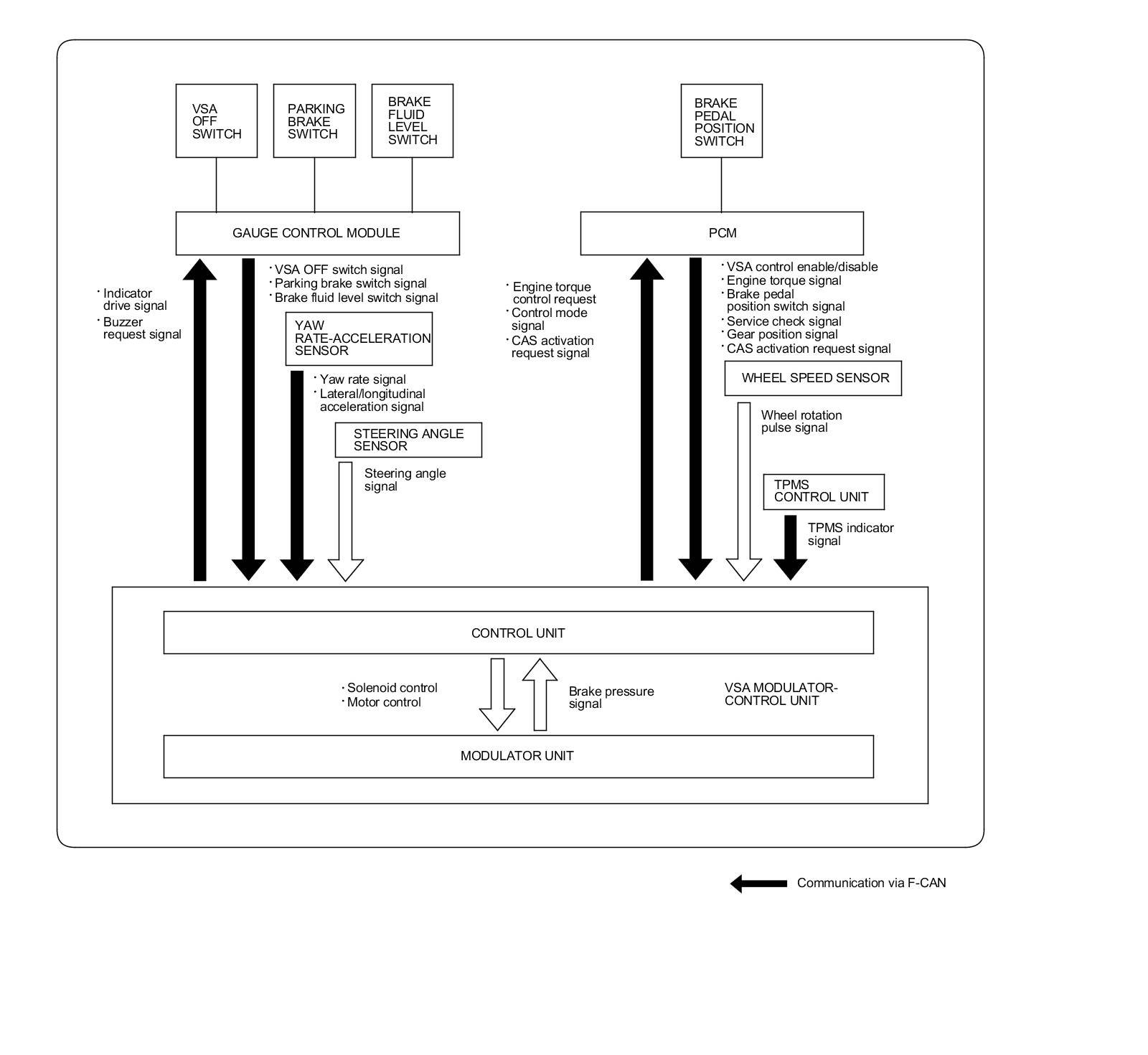 This system is composed of the VSA modulator-control unit, the wheel speed sensors, the steering angle sensor, the yaw rate-acceleration sensor, and the system indicators in the gauge control module. The VSA modulator-control unit controls the Anti-Lock Brake System (ABS), the Electronic Brake Distribution (EBD), the Traction Control System (TCS), the Vehicle Stability Assist (VSA), the Creep Aid System (CAS), the Hill Start Assist (HSA), and brake assist with the brake pressure of each wheel and reduces engine torque.