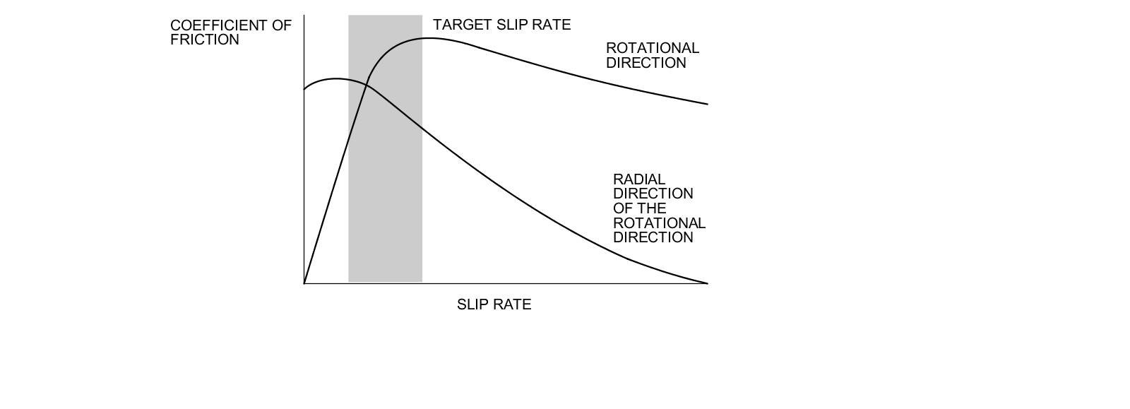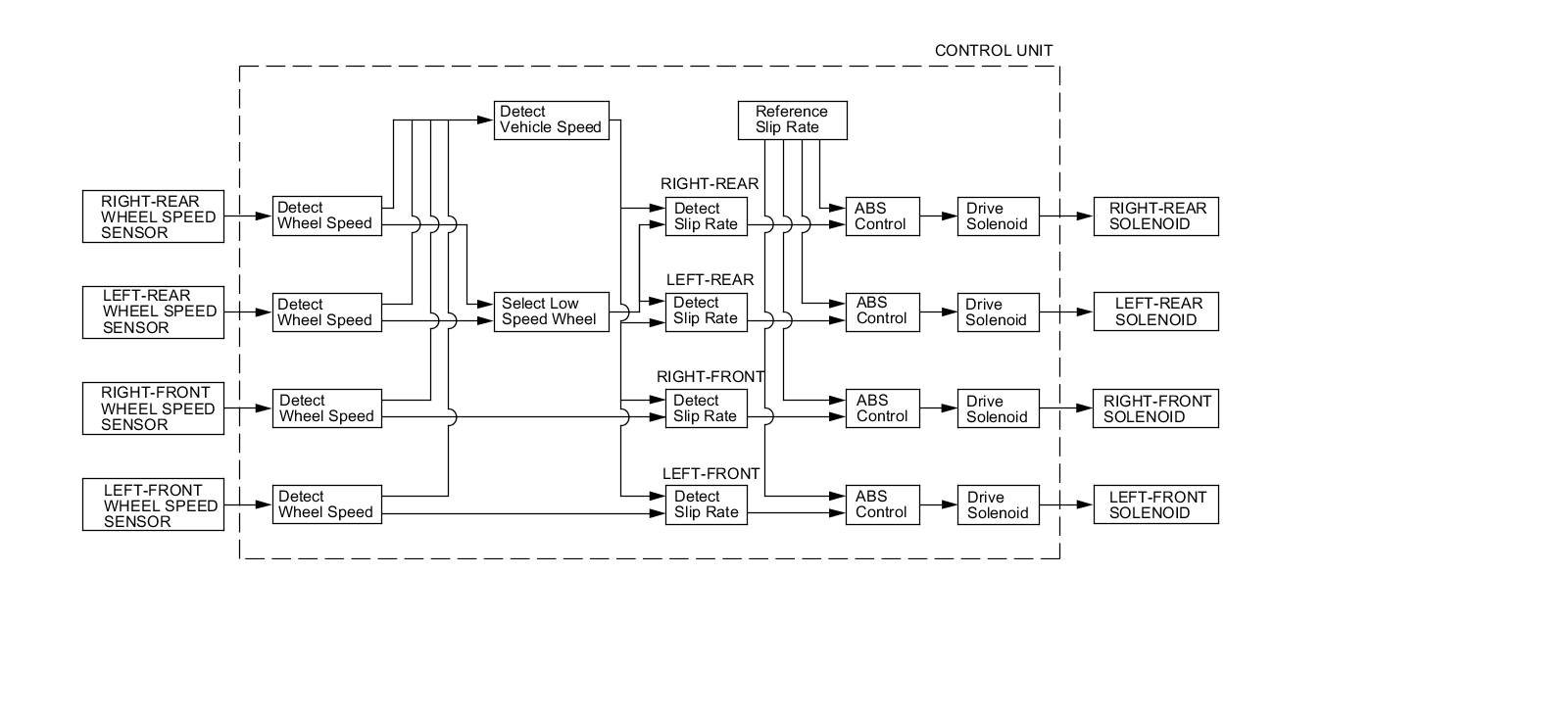 Without ABS, when the brake pedal is pressed while driving, the wheels sometimes lock before the vehicle comes to a stop. In such an event, the maneuverability of the vehicle is reduced if the front wheels are locked, and the stability of the vehicle is reduced if the rear wheels are locked, creating an extremely unstable condition. With ABS, the system precisely controls the slip rate of the wheels to ensure maximum grip force from the tires, and it thereby ensures maneuverability and stability of the vehicle. The ABS calculates the slip rate of the wheels based on the four wheel speeds, and then it controls the brake fluid pressure to reach the target slip rate.