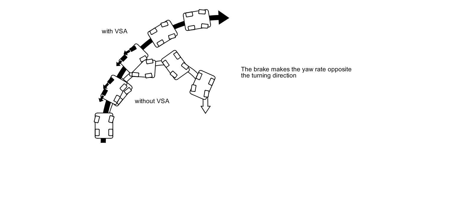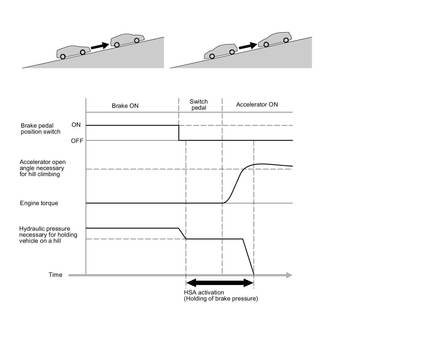 Prevents the vehicle from rolling backwards when moving your foot from the brake pedal to the accelerator pedal while stopped on a steep hill. The control unit reads the angle of inclination from the yaw rate-acceleration sensor, and that all four wheels are stopped, then it calculates the amount of fluid pressure required to keep the vehicle from rolling backward when the control unit sees the brake pressure decrease as the driver lifts their foot off of the brake pedal, and moves their foot to the accelerator pedal. The HSA also works when the vehicle is stopped on a downhill slope.