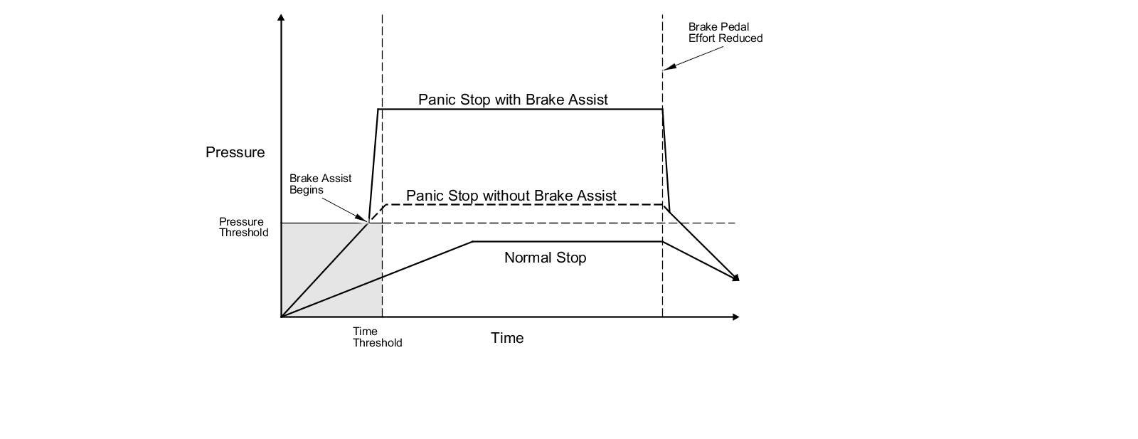 Brake assist helps ensure that any driver can achieve the full braking potential of the vehicle by increasing brake system pressure in a panic situation, bringing the vehicle into a full ABS stop.