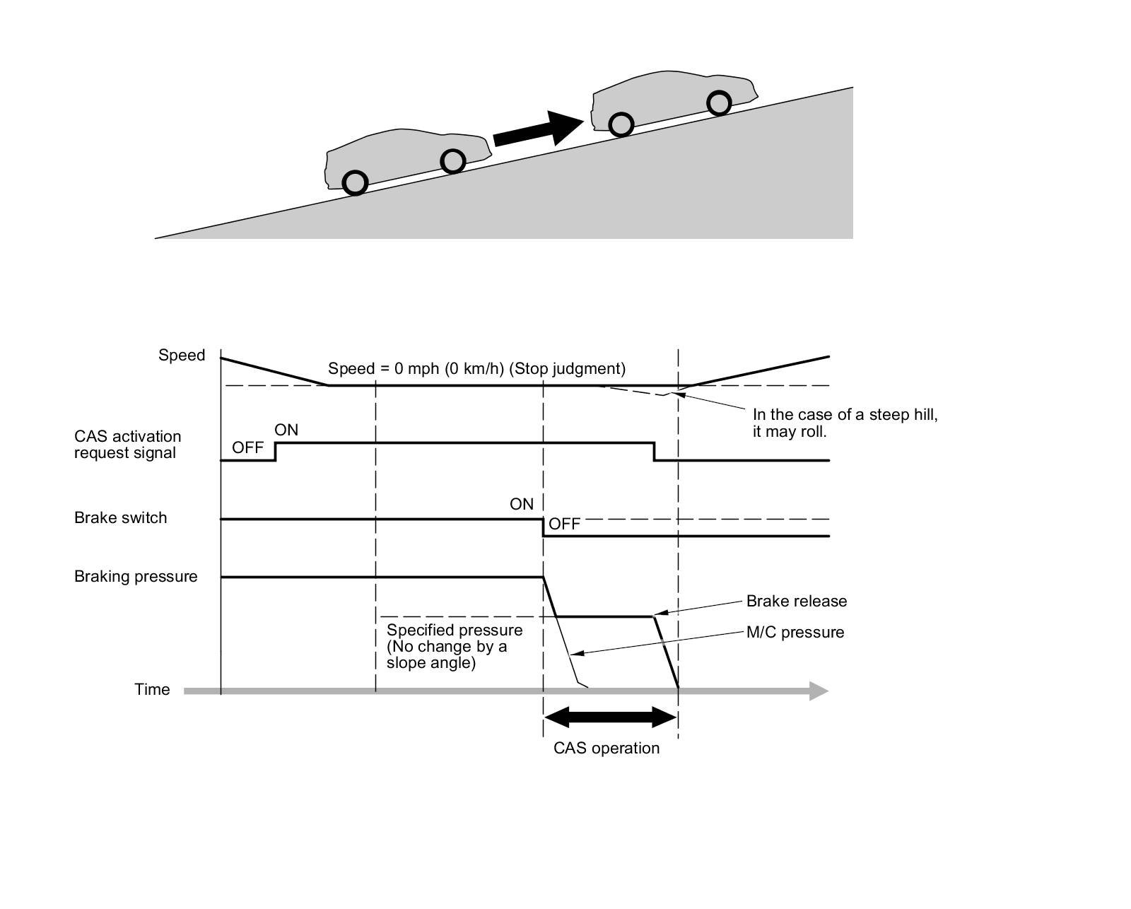 When the VSA modulator control unit receives a CAS activation request signal from the PCM, the system assists the driver to get the vehicle started by holding the brake pressure. This control is done not only on hills, but also on level roads. When the driver lifts their foot off the brake pedal to get the vehicle started, the brake switch is turned off, and then the brake pressure is held by operating the TCS valve and the ESV valve.