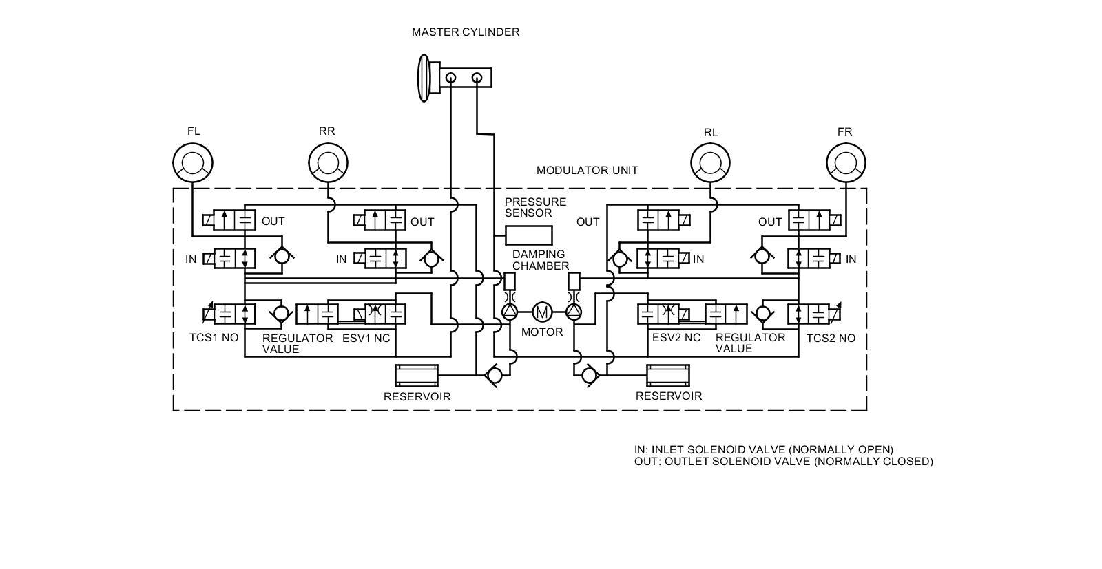 The modulator unit consists of the inlet solenoid valve, the outlet solenoid valve, the TCS NO (normally open) solenoid valve, the ESV NC (normally closed) solenoid valve, the reservoir, the pump, and the pump motor.