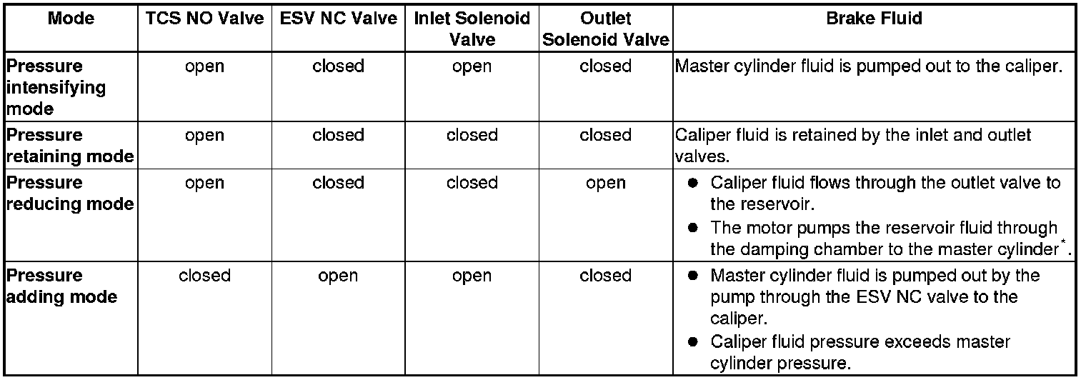 The hydraulic control has three modes of ABS action; pressure intensifying, pressure retaining, and pressure reducing. Pressure intensifying (VSA) mode is combined of the TCS, VSA, CAS, HSA and brake assist action.