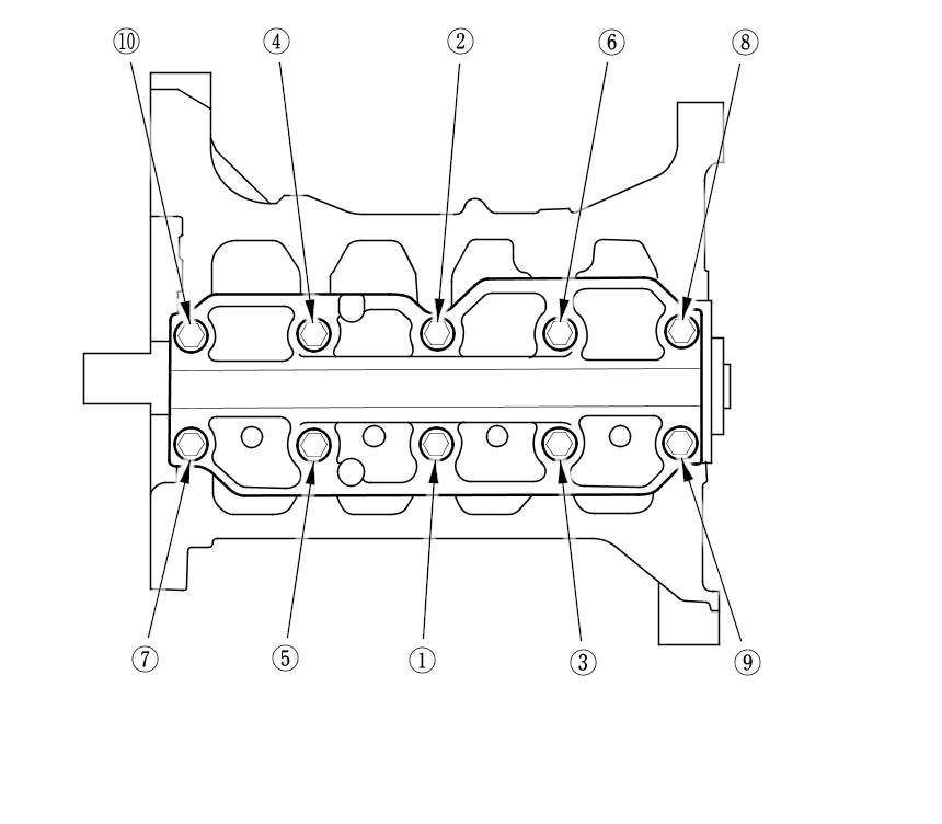 4. Reinstall the bearings and bearing cap bridge, then torque the bearing cap bolts to 25 N-m (2.5 kgf-m, 18 lbf-ft) in the proper sequence.