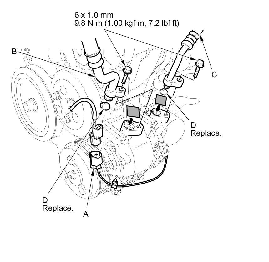6. Remove the compressor clutch connector (A) from the condenser fan shroud, then disconnect the connector. Remove the bolts, then disconnect the suction line (B) and the discharge line (C) from the compressor, and remove the O-rings (D). Plug or cap the lines immediately after disconnecting them to avoid moisture and dust contamination.