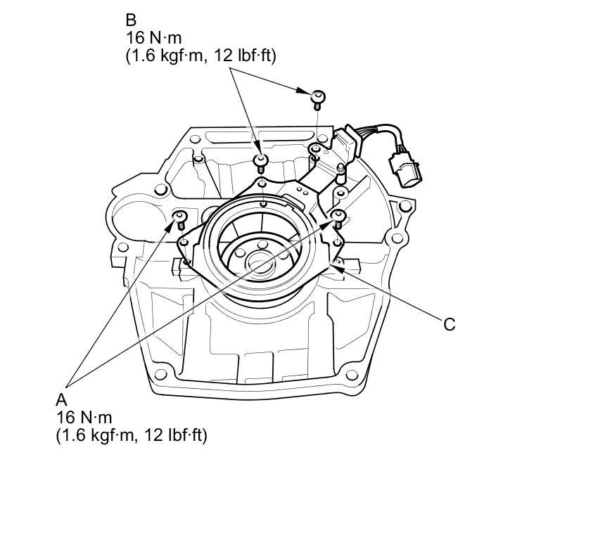 2. Remove the bolts (A, B) and the IMA motor rotor position sensor (C).
