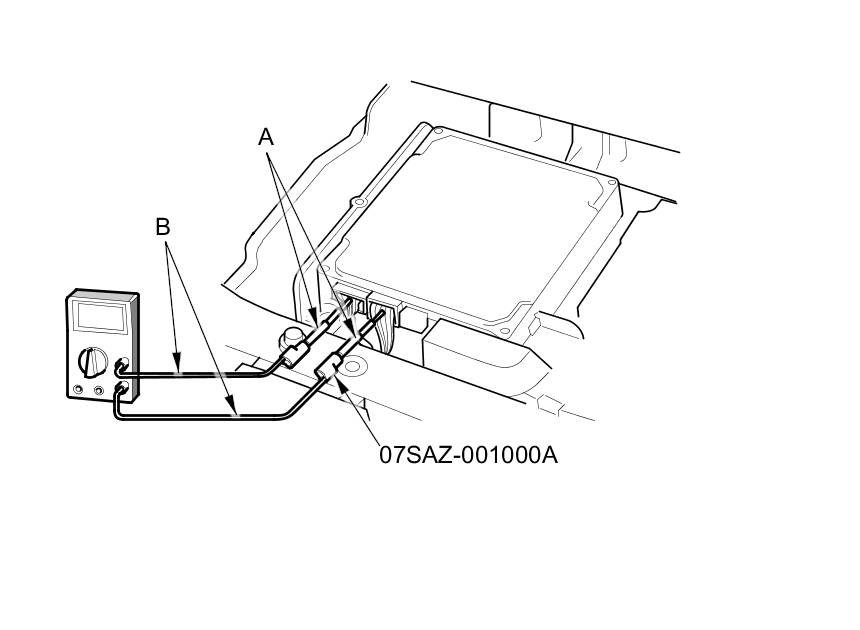 3. Connect the backprobe adapters (A) to the stacking patch cords (B), and connect the cords to a digital multimeter.