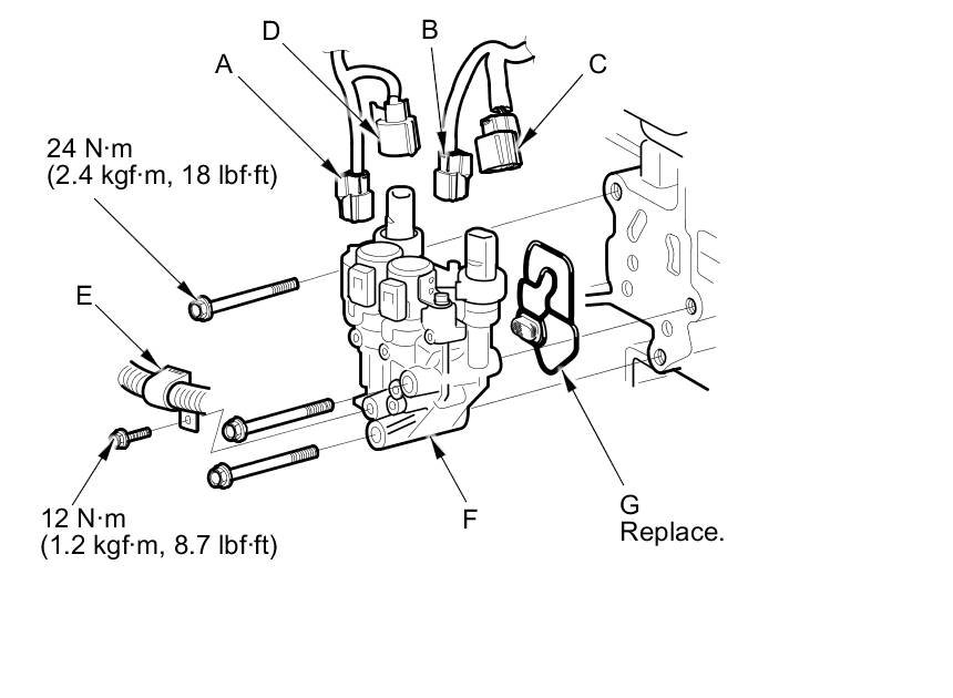 6. Install the valve in the reverse order of removal with a new rocker arm oil control valve filter (G).