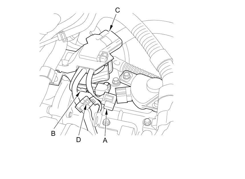 18. Connect the transmission range switch 8P connector (C), and the CVT output shaft (driven pulley) speed sensor 3P connector (D).