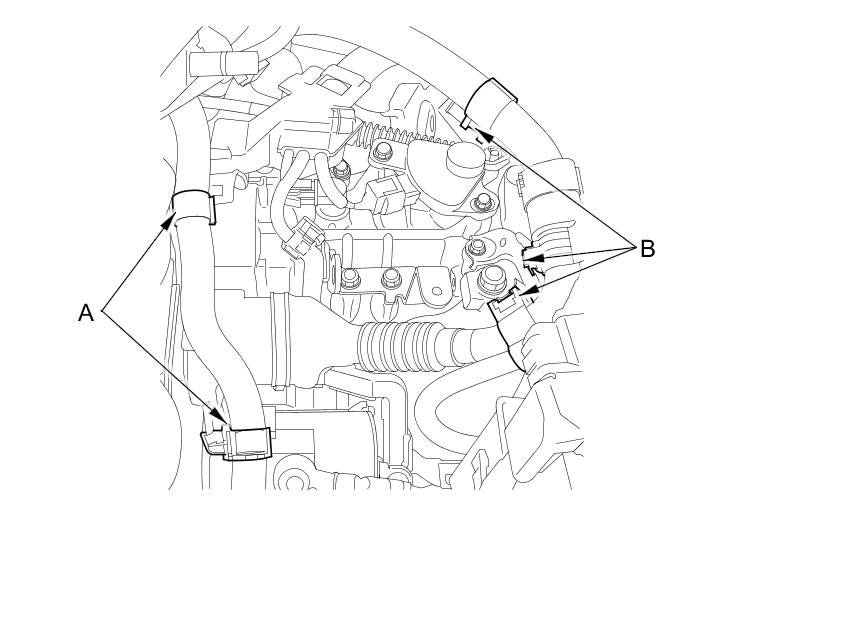 19. Install the heater hose clamps (A) and IMA motor power cable clamp (B).