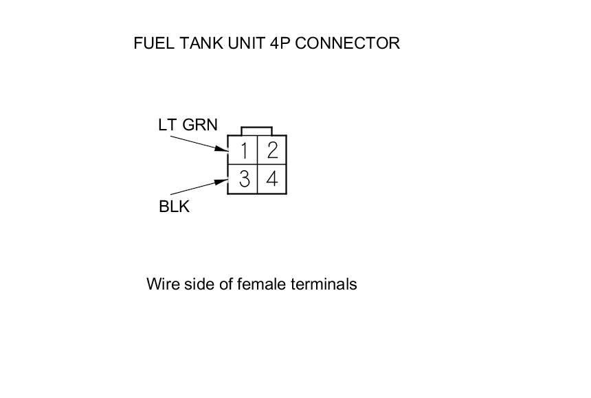 7. Measure the voltage between fuel tank unit 4P connector terminals No. 1 and No. 3 with the ignition switch turned to ON (II). There should be battery voltage.