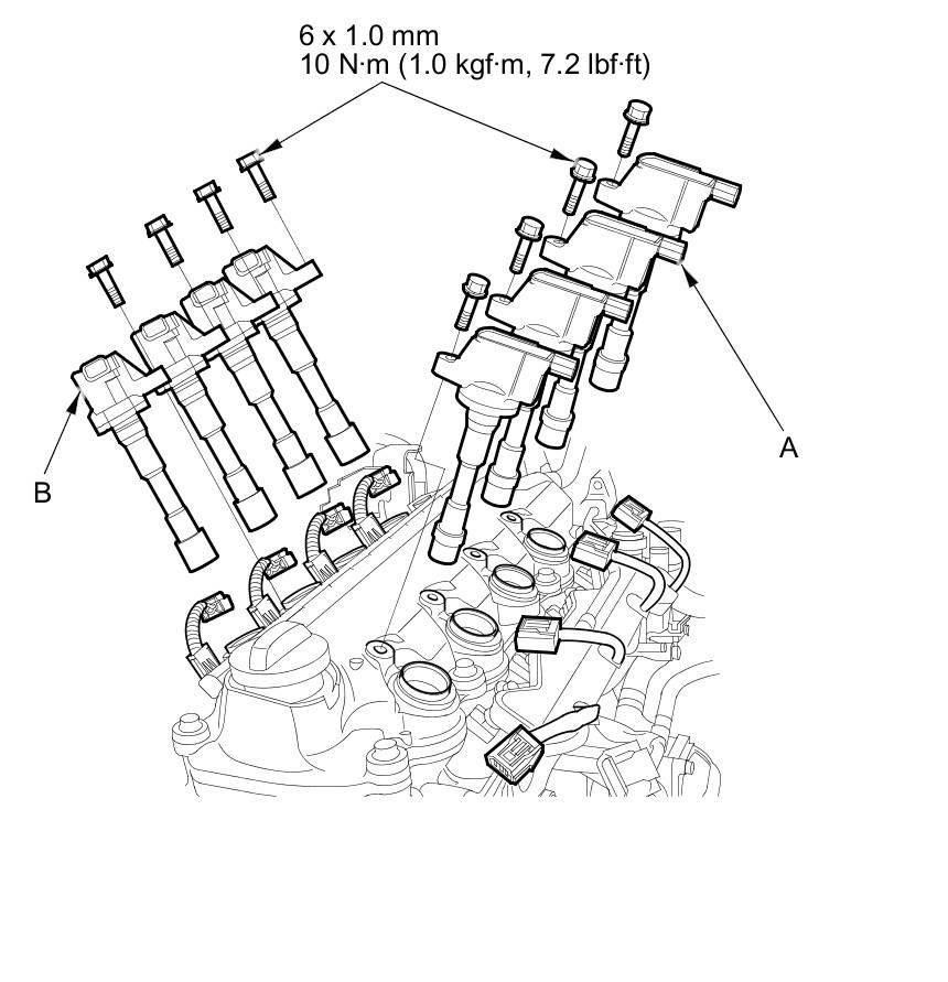 3. Disconnect the ignition coil connectors, then remove the intake side ignition coils (A) and the exhaust side ignition coils (B).