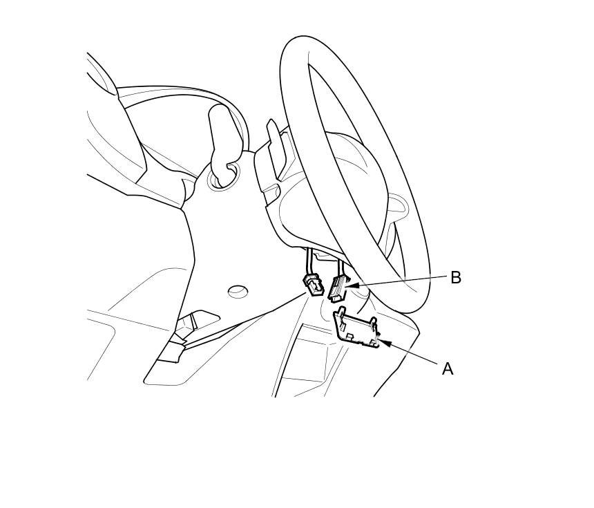 4. Remove the access panel (A) from the steering wheel, then disconnect the driver's airbag 4P connector (B) from the cable reel.