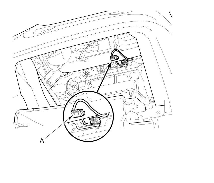6. Disconnect the dashboard wire harness 4P connector (A) from the front passenger's airbag.