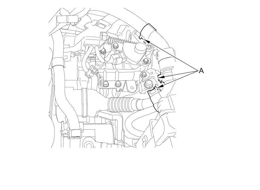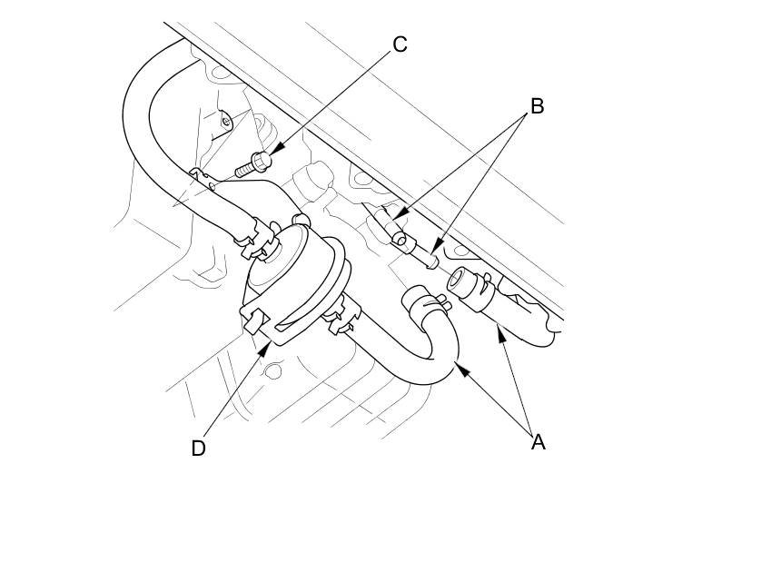21. Disconnect the CVTF cooler hoses (A) from the CVTF cooler pipes (B), then plug the CVTF cooler hoses and the pipes.