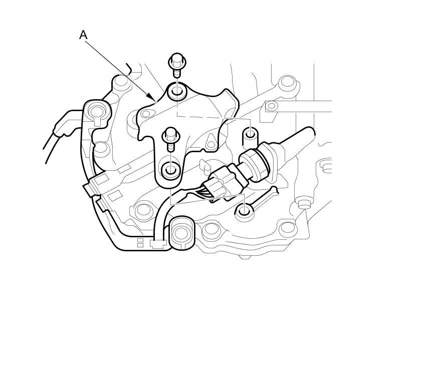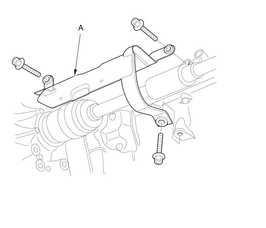 42. Place a jack under the transmission, raise it just enough to take it off of the lower torque rod, and remove the torque rod bolt (A) from the transmission.