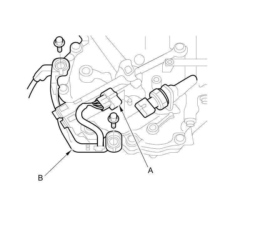 23. Disconnect the solenoid wire harness 8P connector (A) and the CVT input shaft (drive pulley) speed sensor 3P connector (B).