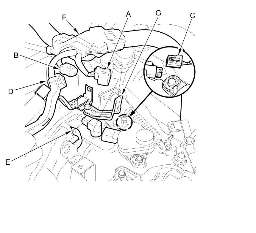 6. Remove the harness clamps (C) from the clamp brackets (D), and remove the starter harness (E) from the harness clamp (F) on the battery tray (G).