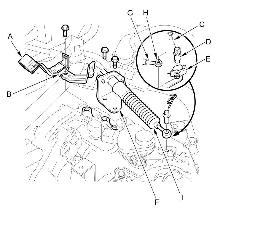 29. Remove the bolts securing the shift cable holder (F), then separate the shift cable end (G) from the selector control lever. Check the shift cable end collar (H) for wear or damage, and replace the shift cable (I) Service and Repair if necessary.