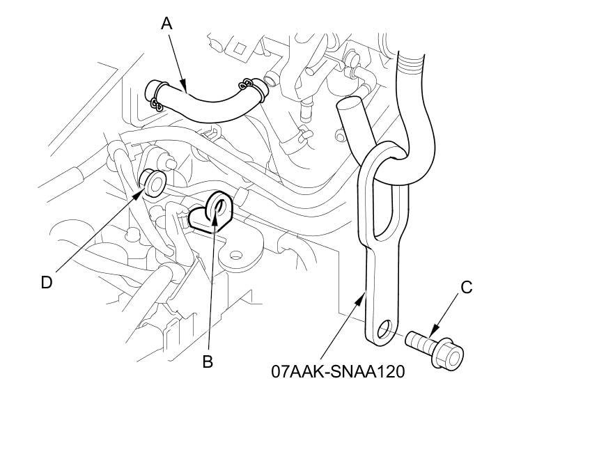 34. Install the sub hunger stay (07AAK-SNAA120) to the air cleaner bracket hole (B) with a bolt (C) and a nut (D).