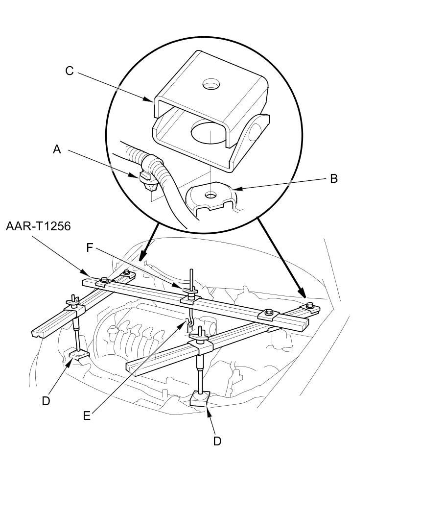 36. Install the engine support hanger (AAR-T1256). Carefully position the engine support hanger to the vehicle; position both cross-arm foot bases (C) over the harness clamp brackets on both sides, and position both front stands (D) on the front bulkhead. Attach the hook (E) to the hanger stay, tighten the wing nut (F) by hand, to lift and support the engine.