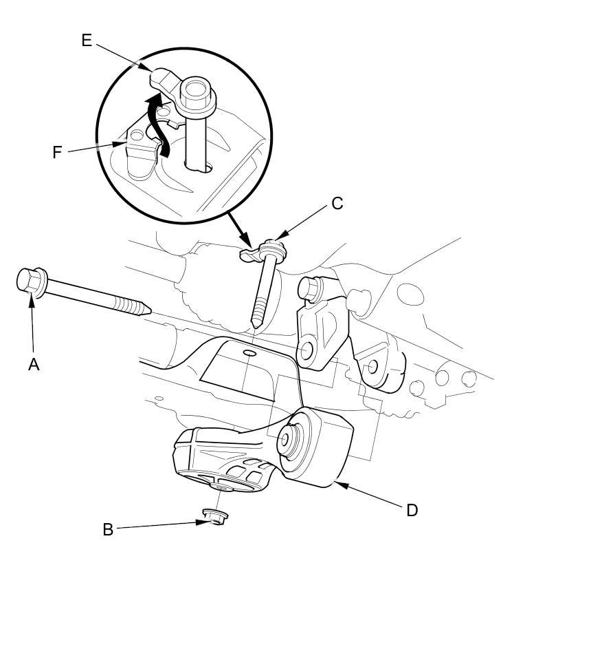 NOTE: Make sure the tab (E) on the bolt head aligned with the guide (F) on the front subframe.