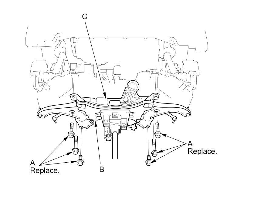 45. Remove the six bolts (A) securing the front subframe (B), then remove the subframe with the steering gearbox (C).