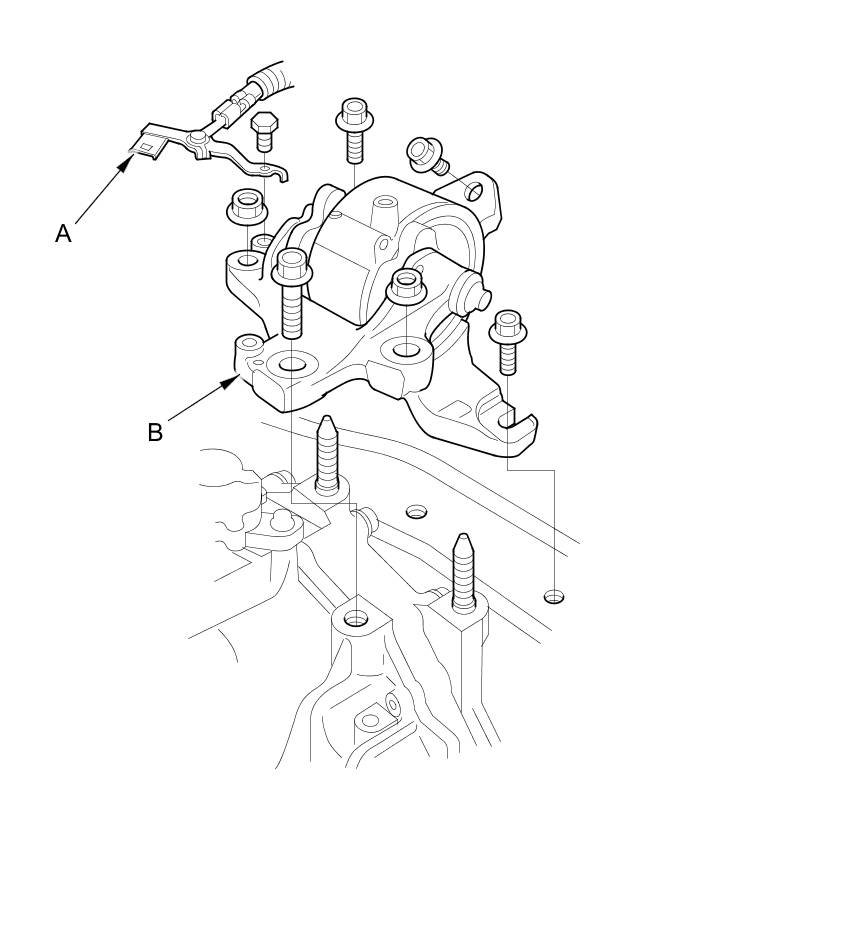 49. Remove the bolts and the nuts, and the transmission mount/bracket (B).
