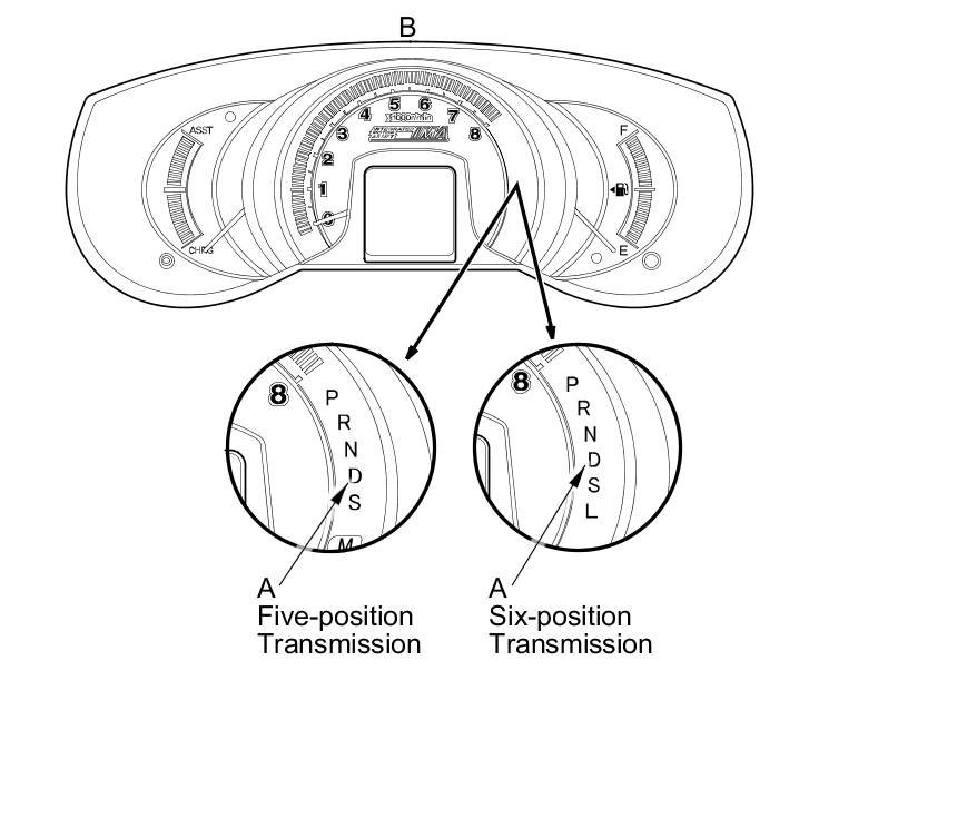 When the powertrain control module (PCM) senses an abnormality in the input or output system, the D indicator (A) in the gauge control module (B) will usually blink.