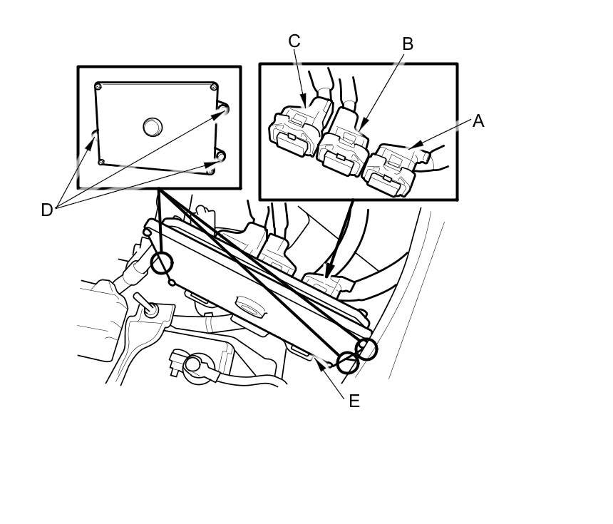 4. Disconnect PCM connectors A, B, and C, then remove the PCM (E).